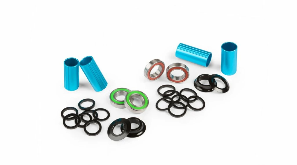 Roulements de pédalier standard espagnols. Deux manchons intérieurs pour coques de pédalier de 68 mm et 73 mm et un jeu d’entretoises en aluminium inclus. Pour 2011, les manchons intérieurs ont des coupes CNC pour réduire le poids. Option pour axe de 19 mm ou 22 mm.