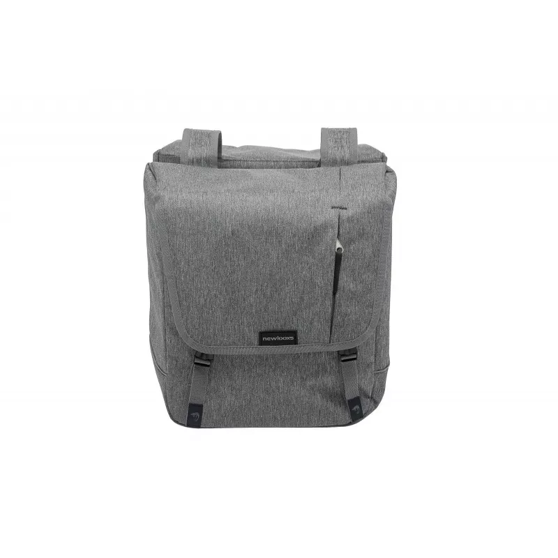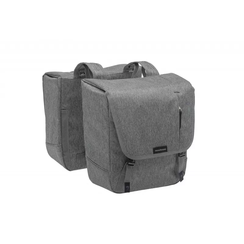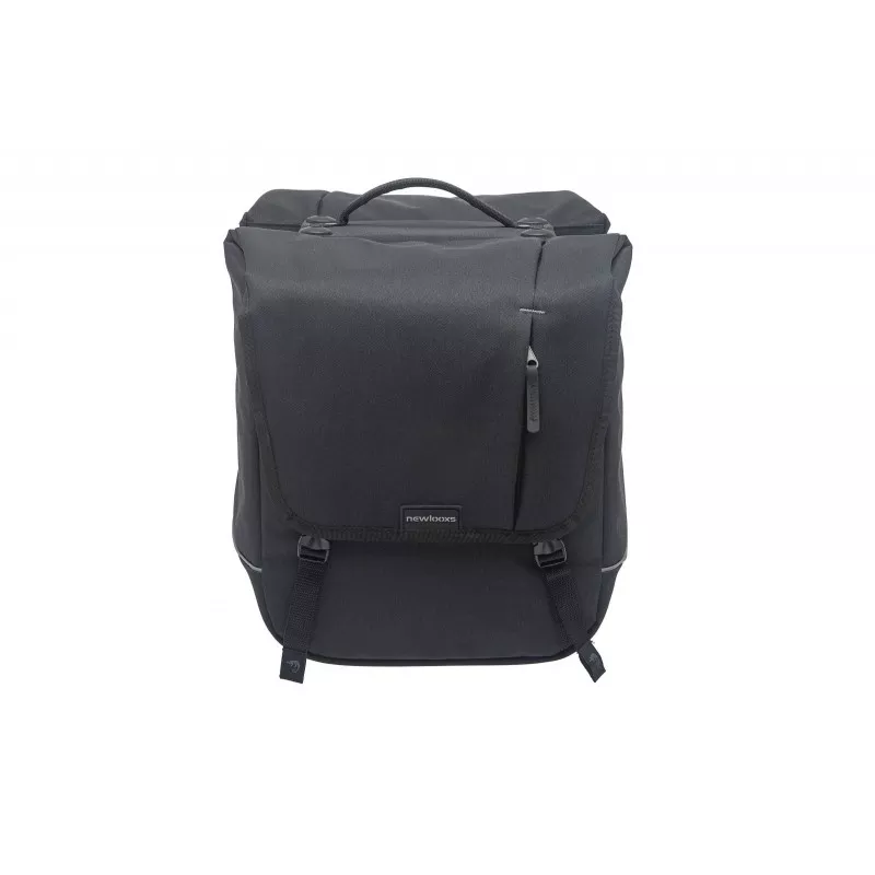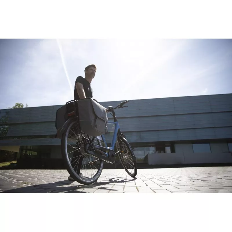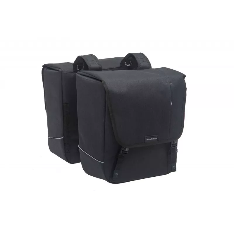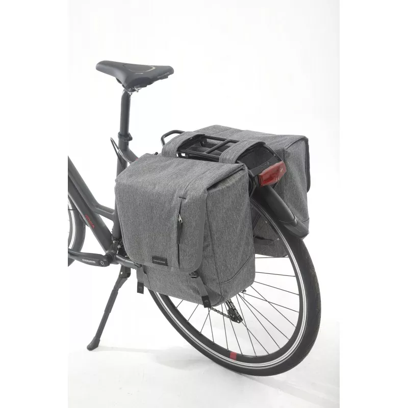 Sacoche double imperméable de 32L pour vélo avec deux grands compartiments et 3 poches zippées. Des bandes réfléchissantes de chaque côté des sacoches.